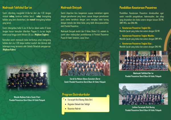 Didukung dengan suasana yang religius, asri, dan penuh ketenangan, Pondok Pesantren Darul Ulum Al-Falah Palupuh menjadi tempat yang ideal untuk menuntut ilmu sekaligus memperkuat keimanan.