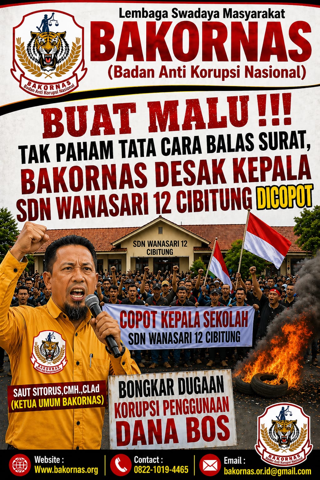 | BAKORNAS | Kab. Bekasi – Badan Anti Korupsi Nasional (BAKORNAS) mengungkapkan keragu-raguan terkait transparansi penggunaan dan alokasi Dana BOS di SDN Wanasari 12 untuk tahun 2025. Ini disampaikan secara langsung oleh Saut Sitorus,CMH.,CLAd sebagai ketua umum BAKORNAS pada wartawan pada 27/04/26.