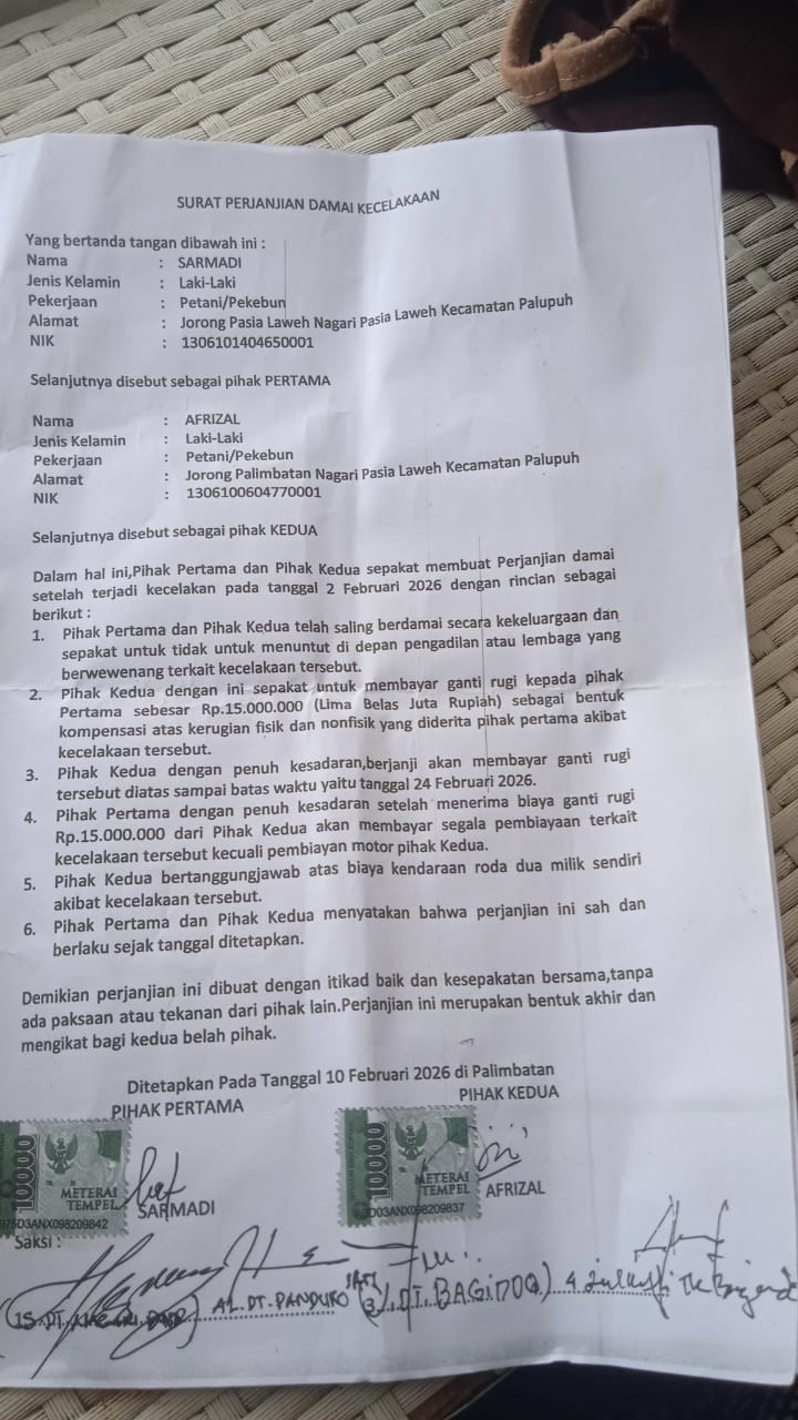 Agam, Sumatera Barat — Upaya mengungkap berbagai keluhan masyarakat kembali menjadi sorotan. Kali ini, sebuah kasus kecelakaan lalu lintas yang terjadi di wilayah Aia Malambuih, Jorong Palupuh, Nagari Pasia Laweh, Kecamatan Palupuh, Kabupaten Agam, memunculkan polemik serius, khususnya terkait proses perdamaian dan kelanjutan hukum.