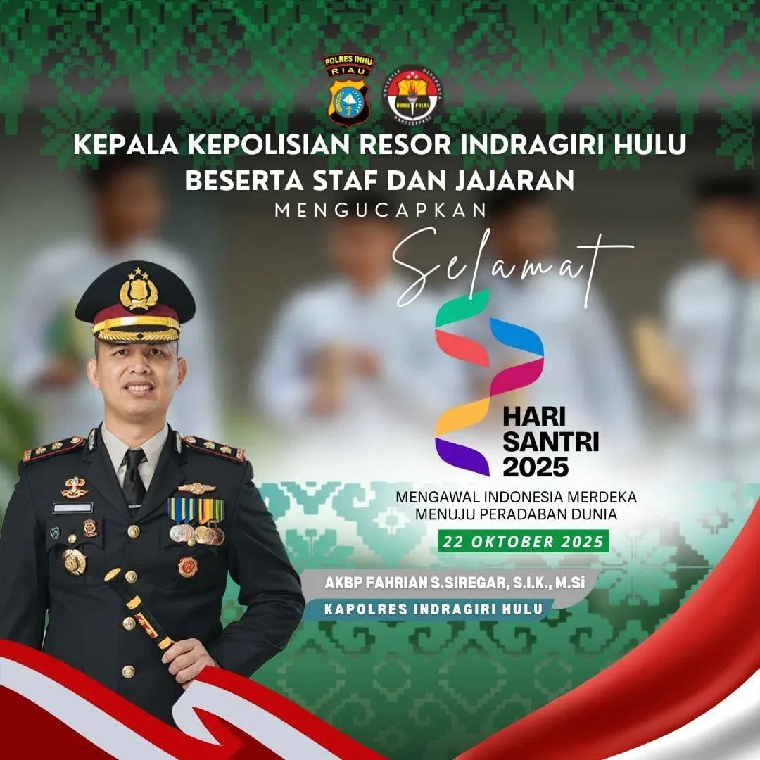 Kapolres Indragiri Hulu (INHU) AKBP Fahrian Saleh Siregar, S.I.K., M.Si Beserta jajaran menyampaikan ucapan selamat Hari Santri Nasional yang diperingati pada hari ini tanggal 22 Oktober 2025. Ucapan ini disampaikan sebagai bentuk apresiasi terhadap peran penting santri dalam pembangunan bangsa dan negara.