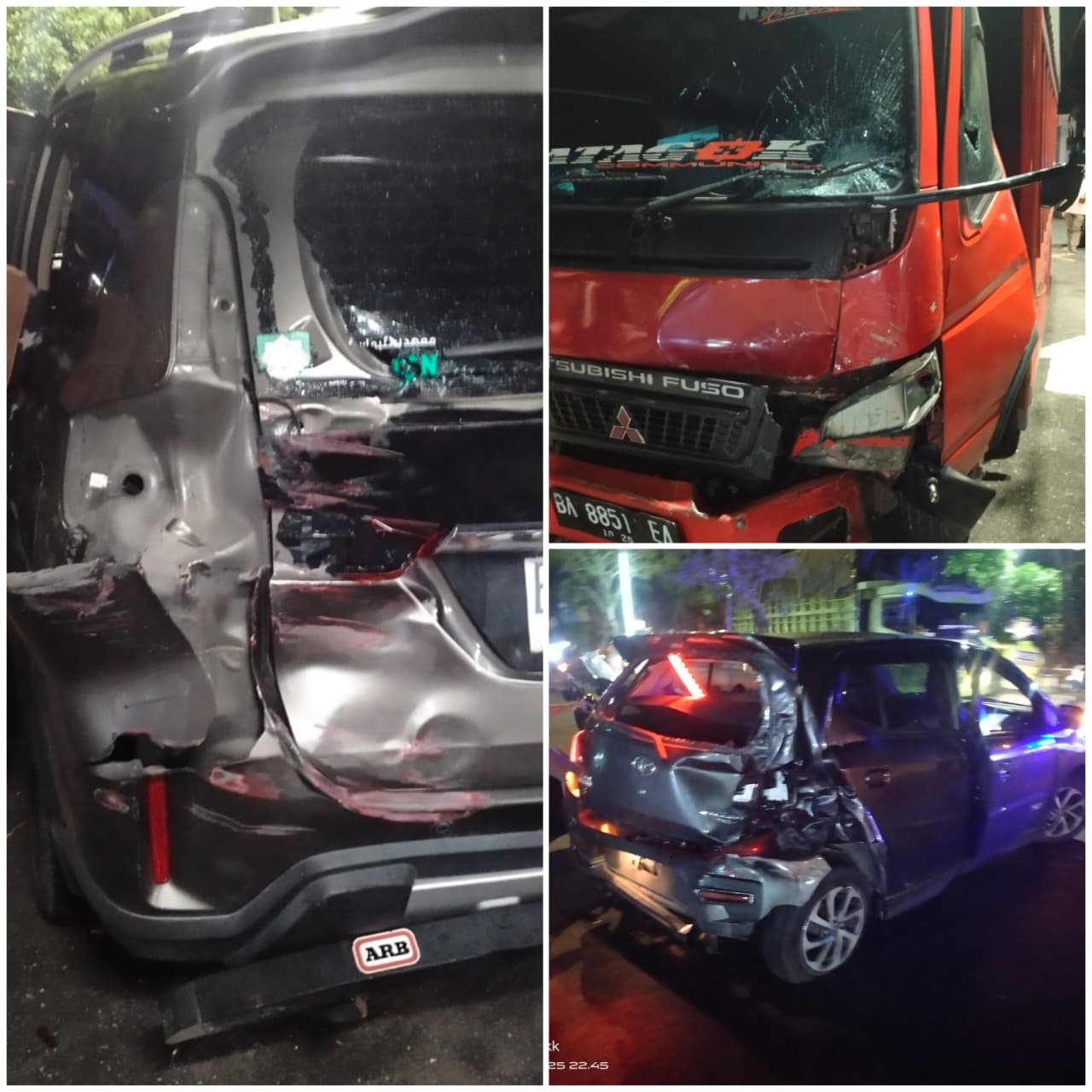 Berdasarkan informasi di lapangan, dua mobil pribadi tersebut tengah bersiap berbelok ke arah kanan. Namun tiba-tiba, truk colt diesel yang melaju dengan kecepatan cukup tinggi tidak mampu mengendalikan laju kendaraan dan langsung menghantam bagian belakang kedua mobil.