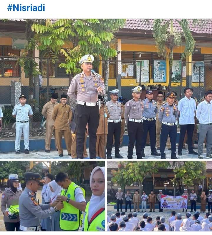 KUANTANSINGINGI,–Intelkriminal.co.id Dalam rangka memperingati Hari Ulang Tahun (HUT) Lalu Lintas Bhayangkara ke-70, Kepolisian Resor Kuantan Singingi bersama Forum Lalu Lintas dan Angkutan Jalan (LLAJ) melaksanakan kampanye keselamatan berlalu lintas di SMKN 2 Teluk Kuantan, Senin (8/9/2025) pukul 07.30 WIB. Kegiatan ini dirangkai dengan pelaksanaan upacara bendera di lapangan sekolah tersebut.