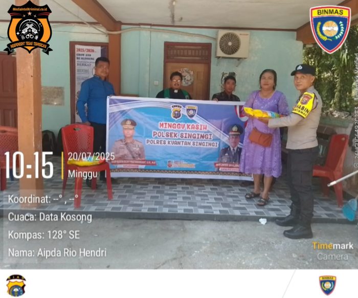 KUANTANSINGINGI, intelkriminal.co.id – Kepolisian Sektor (Polsek) Singingi, Polres Kuantan Singingi, kembali melaksanakan kegiatan Minggu Kasih sebagai bentuk kepedulian serta pendekatan humanis kepada masyarakat. Kegiatan ini digelar pada Minggu, (20/07/2025) pukul 10.30 WIB bertempat di Gereja Methodist Indonesia (GMI) Jalur IV, Desa Sungai Keranji, Kecamatan Singingi, Kabupaten Kuansing.