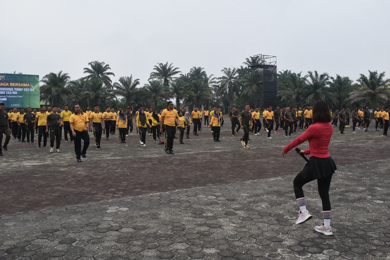 Setelah apel bersama, kegiatan dilanjutkan dengan olahraga senam bersama yang dipandu oleh instruktur senam asal Pekanbaru: Ria Ika, Nola, dan Aini. Suasana penuh keakraban tampak mewarnai lapangan saat personel TNI dan Polri berbaur dan menikmati gerakan senam yang enerjik.